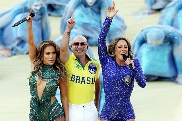 Pitbull was fabulous as always and worked the crowd with the biggest smile. Some regions experienced sound issues but was soon an issue that could be overlooked as the visuals took over and the Lil’ Chico worked his unique brand of magic! Pitbull, JLO and Claudia Leitte had co-ordinated their colours to represent the host nation. Jenny in a sexy green number, Claudia looking hot in blue and Pitbull rocking it in yellow. But not just any yellow, Mr 305 upgraded to Worldwide had ditched the signature suit and tie and instead opted for a Brazil football shirt tucked into white crops/trousers turned up for a more casual look. Any thoughts of issuing a red card for tucking the football shirt in we’re diminished by “Hey, it’s Pitbull. He stands out, doesn’t blend in and likes to do things differently and I can certainly appreciate that- besides he still looked very cute” Mr WW has yet another gift of being able to pull off unusual colour and style combinations.