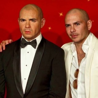 After sitting patiently for a reported 300 measures for getting the statue just right and donating his own tuxedo and sunglasses to perfect the look we have a Pitbull clone!