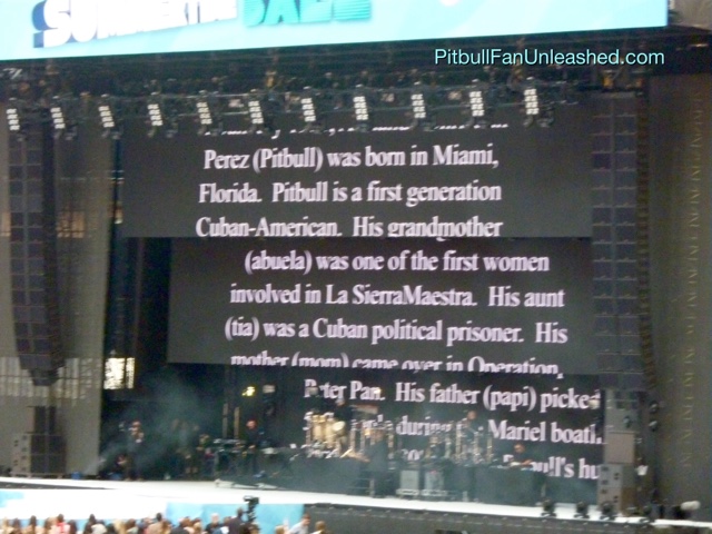 A dramatic introduction before jumping on stage, we had the backdrop on screen of the history and journey of Pitbull along with teachings of a few spanish words. Pitbull’s birth, parents and more about his background amongst other things which was informative and enjoyable. As a die-hard fan, in someways very emotional to read and remember how far Pitbull has come and is now spreading his unique brand of magic and holding up a beacon of positivity, energy and light as an encouragement to his fans in all walks of life.
