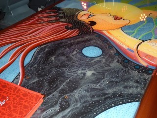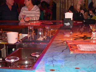 Bar tops detailed with unique and vibrant mosaic designs to aquatic motion fish images through submarine style window screens behind bar areas to enchant even more.