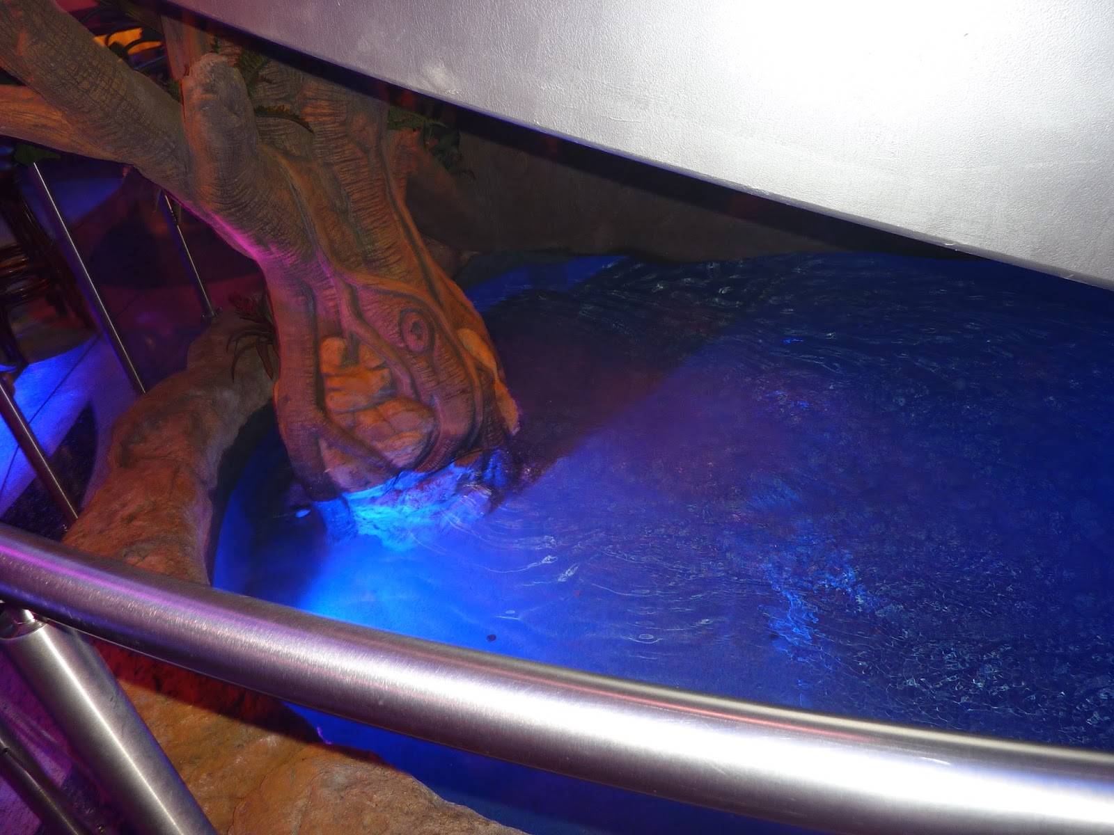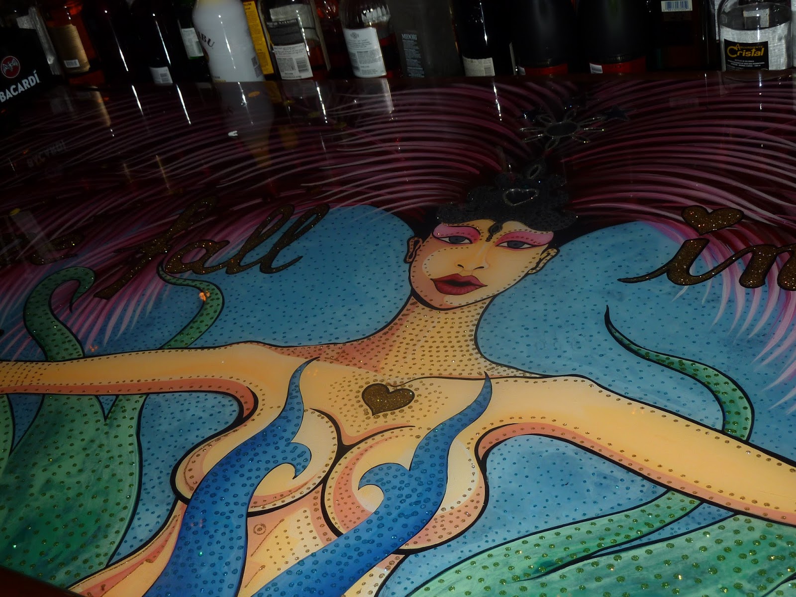 Bar tops detailed with unique and vibrant mosaic designs to aquatic motion fish images through submarine style window screens behind bar areas to enchant even more.