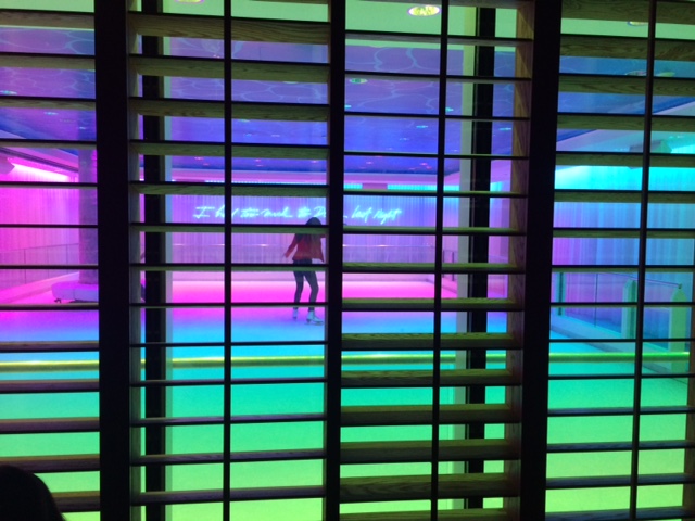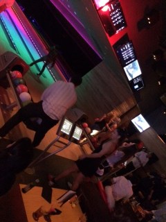 Fun, edgy, a constant stream of fast and vibrant neon style colour changing effects with a Live DJ pumping out the tunes. Entertainers skating around dressed in tu-tu’s to wigs and more. This bar come nightclub is something quite unique, quirky, surreal and freakish – and it’s only a Monday night! As you look around in delight and amazement while enjoying a Voli mix directly opposite and virtually attached to the bar we have a bowling alley and to the left an ice skating rink lit up bright like it’s Christmas every day.