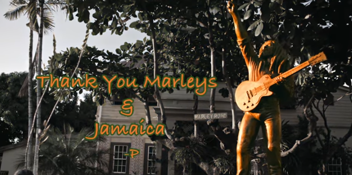 An end still shot. Mr Worldwide grateful as always, stops with a shot as simply ‘Thank you to the Marleys and Jamaica’ by the iconic Bob Marley statue one hand on guitar and other in the air at the museum. At the end of all that I can say what a really cool video capturing a lot of Marley History and bringing it on screen to share with the globe, especially the studios, statue and museum.