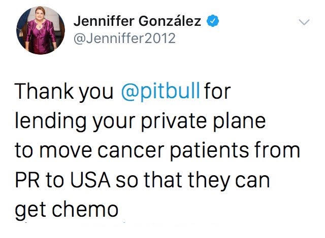 “Thank you @pitbull for lending your private plane to move cancer patients from PR to USA so that they can get chemo,” Tweeted Puerto Rico congresswoman Jenniffer Gonzalez.